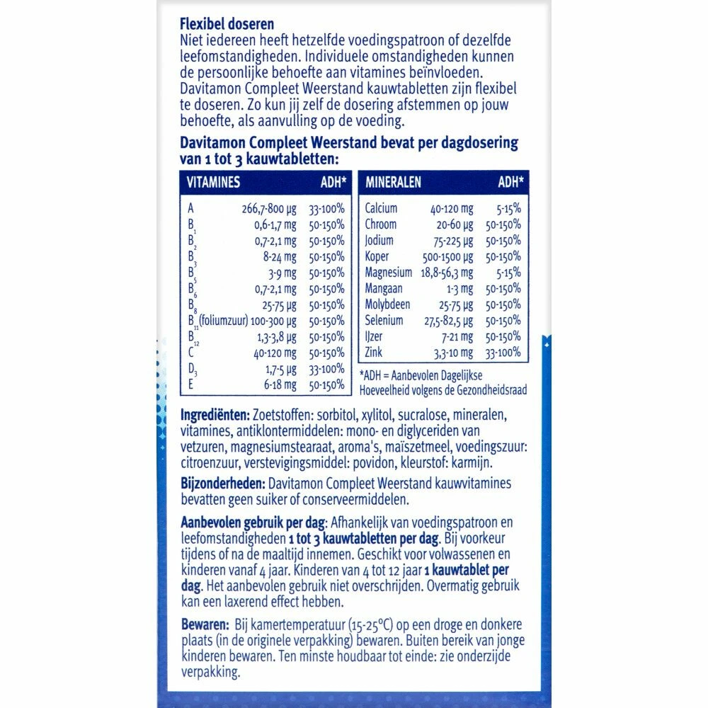Kauwvitamines met bosvruchtensmaakDavitamon KauwVitamines zijn multivitamines in de vorm van Kauwtabletten met een lekkere vruchtensmaak.Multivitamine en mineralenLekker en makkelijkZonder water in te nemenLekkere vruchtensmaakOveral en altijdGoed voor spieren en botten(vitamine D)Meer energie(Vitamine B complex), elke dag opnieuw!Meer weerstand(vitamine C)