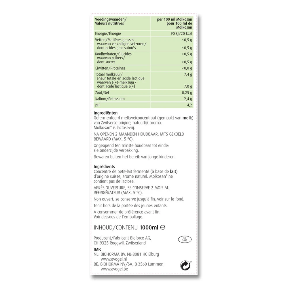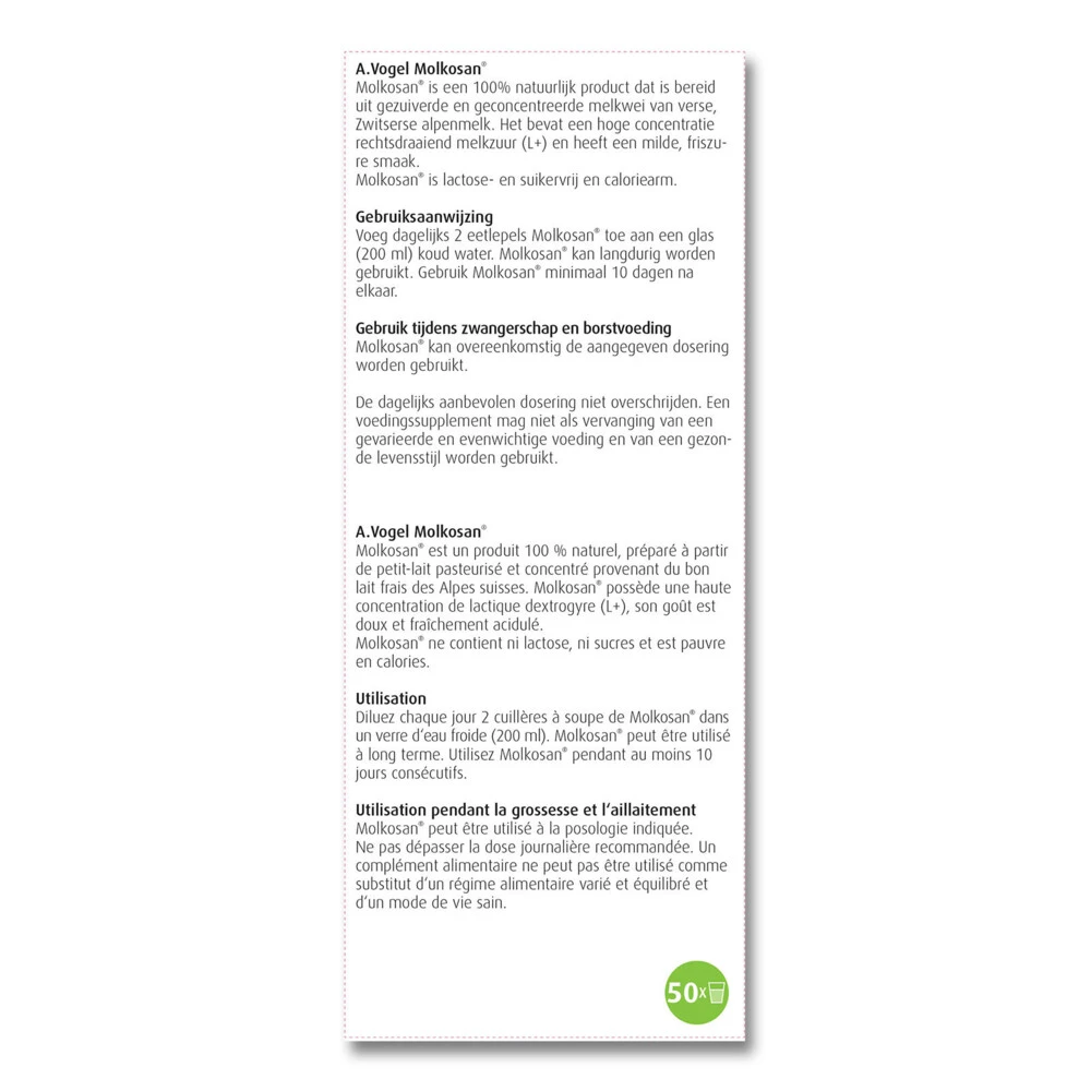 A.Vogel Molkosan A.Vogel Molkosan is een 100% natuurlijk product dat wordt gemaakt uit gezuiverde en geconcentreerde melkwei van verse Zwitserse alpenmelk. Molkosan heeft een milde, friszure smaak, is neutraal van geur en bevat een hogere concentratie rechtsdraaiend melkzuur (L+).Hoge concentratie L(+)-melkzuur (rechtsdraaiend)Molkosan is lactose- en suikervrij en caloriearmHeerlijk om te verwerken in een dressing over de saladeLekker om toe te voegen aan de mueslie