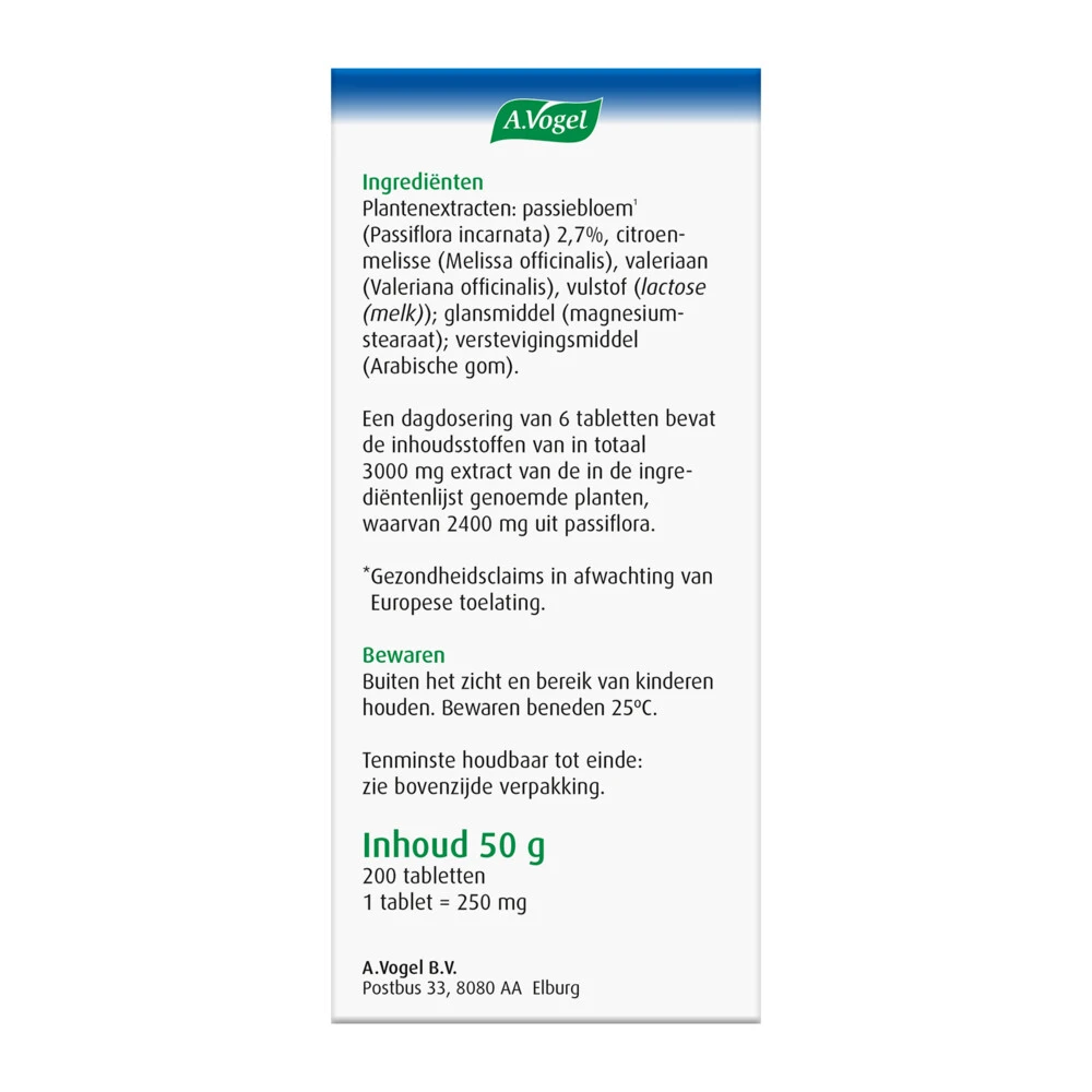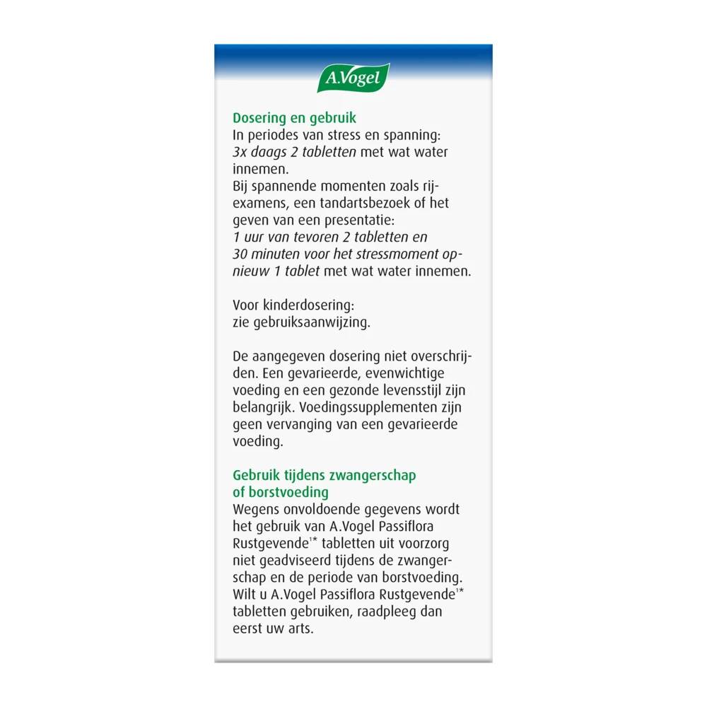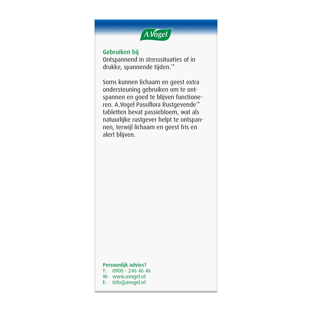 A.Vogel Rustgevend1*Passiflora Rustgevende1* tabletten van A. Vogel is een 100% natuurlijk voedingssupplement en kruidenpreparaat dat helpt bij innerlijke onrust en in periodes van stress of spanning1*, terwijl je toch helder en alert blijft. Ook geschikt voor korte periodes van stress of spanning, zoals (rij)examens of een tandartsbezoek.Bij Innerlijke onrust1*Bij nerveuze gevoelens door periodes van stress of drukke, spannende tijden1*Je blijft helder en alertHelpt snel100% NatuurlijkGeschikt