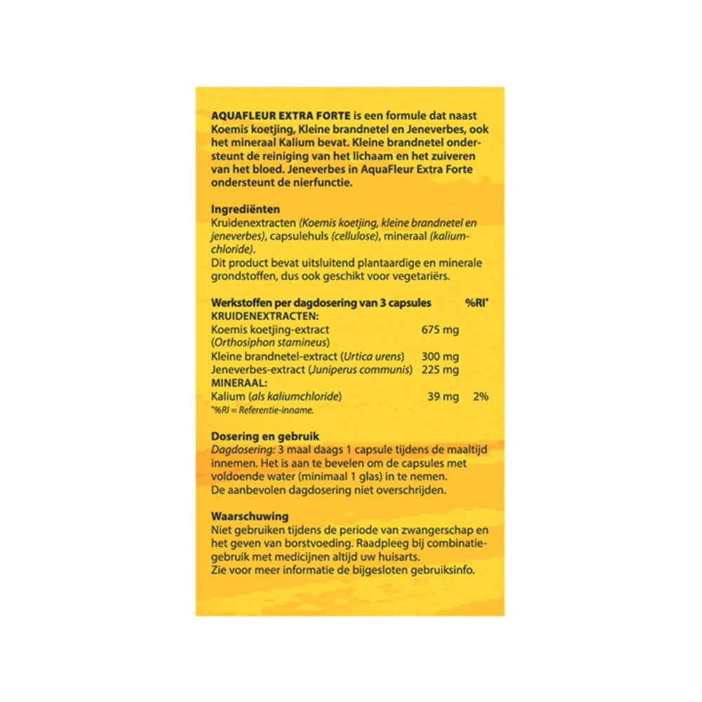 Reinigende Formule*Bloem Aquafleur is een kruidenpreparaat dat Koemis koetjing, Kleine Brandnetel, Jeneverbes enhet mineraal Kalium bevat. Brandnetel reinigt het lichaam en zuivert het bloed en Jeneverbes ondersteunt de nierfunctie.Kleine brandnetel reinigt het lichaam en zuivert het bloedJeneverbes ondersteunt de nierfunctie.*Brandnetel