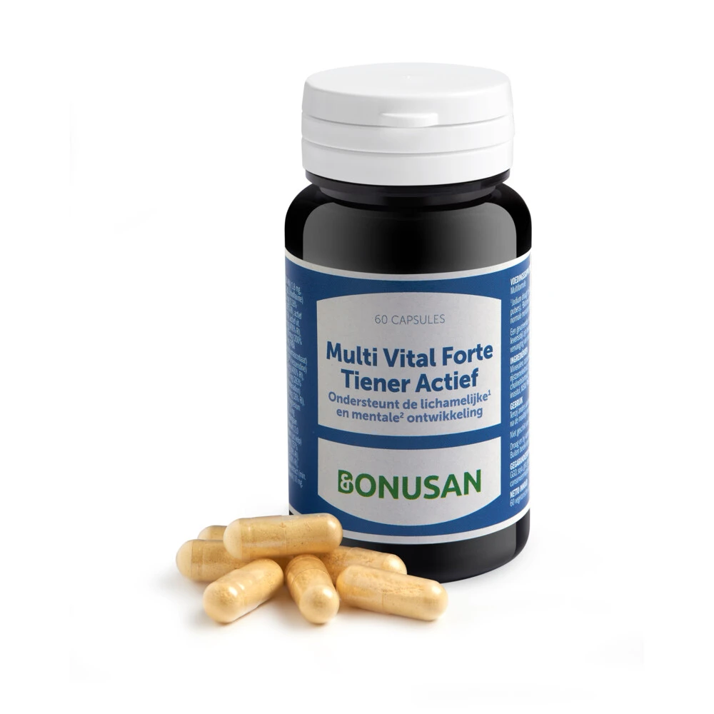 Bonusan Multi Vital Forte Tiener ActiefJuist tieners kunnen extra vitaminen gebruiken. Multi Vital Forte Tiener Actief biedt een keur aan vitaminen en mineralen die hier een positieve bijdrage aan leveren. NMulti Vital Forte Actief Tiener is een buitengewoon complete multi voor de dagelijkse ondersteuning van een gezonde, actieve tiener. Vitaminen en mineralen speciaal afgestemd op tienersJodium draagt bij tot de normale groei van kinderen (en pubers)Biotine bij aan het leervermogen en een no