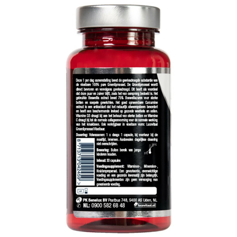 Lucovitaal Groenlipmossel ComplexGroenlipmossel complex van Lucovitaal bevat de gevriesdroogde substantie van de vloeibare 100% pure Groenlipmossel. De Groenlipmossel wordt direct bevroren en vervolgens gevriesdroogd. Dit heeft als voordeel dat deze puur en zuiver blijft, zoals het van oorsprong bedoeld is. Het gebruikte Boswellia extract bevat 75% Boswelliazuren voor sterke botten en soepele gewrichten. Het goed opneembare Curcumine extract is een antioxidant dat het natuurlijk afweersysteem be