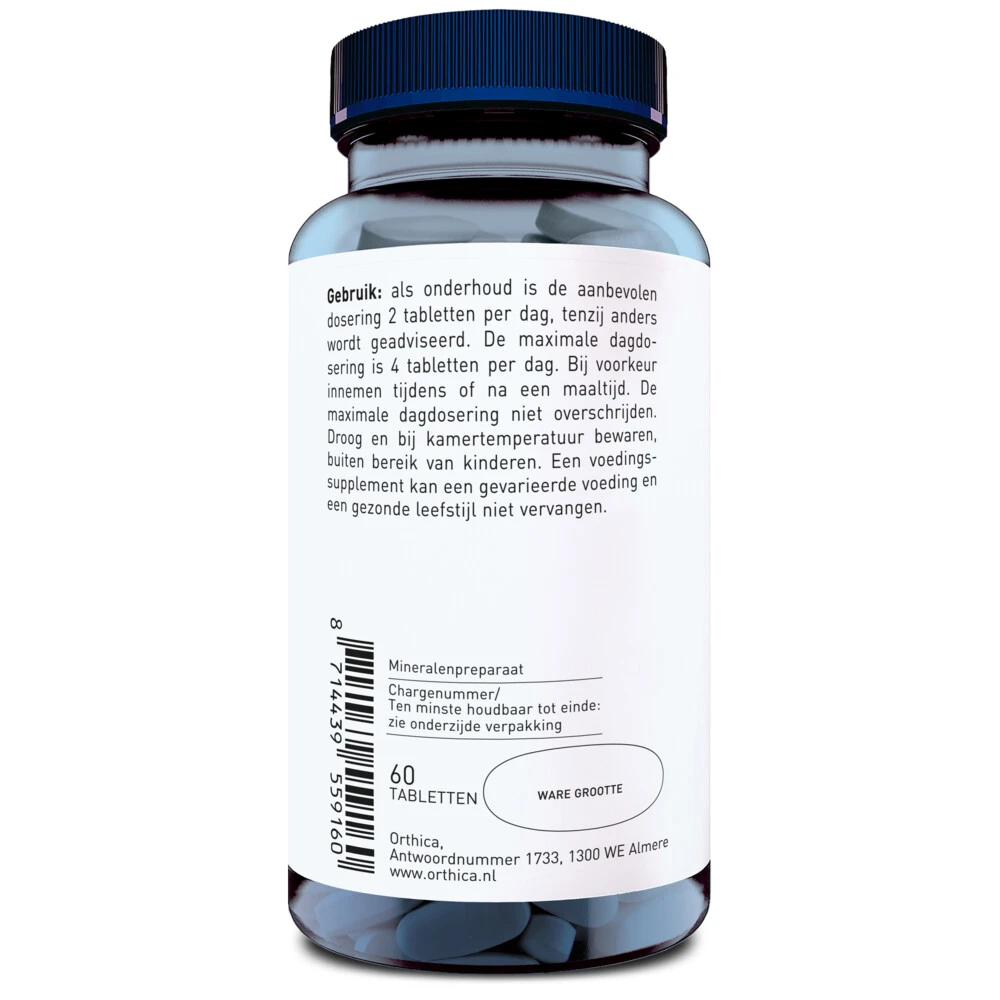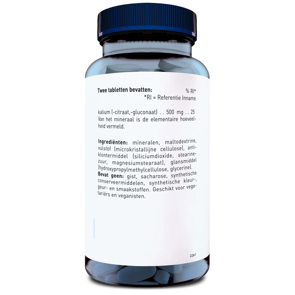 Kalium ondersteunt een normale bloeddruk en spierwerkingKalium is belangrijk mineraal voor het behoud van een normale spierwerking en een normale bloeddruk. Belangrijke bronnen van kalium zijn groenten, fruit, aardappelen, koffie, brood en noten.Voor behoud van normale bloeddrukOndersteunt een normale spierwerkingVegetarischVrij van Gist, sacharose, synthetische conserveermiddelen, synthetische kleur-, geur- en smaakstoffen100% gerecycled plastic, ofwel rPET