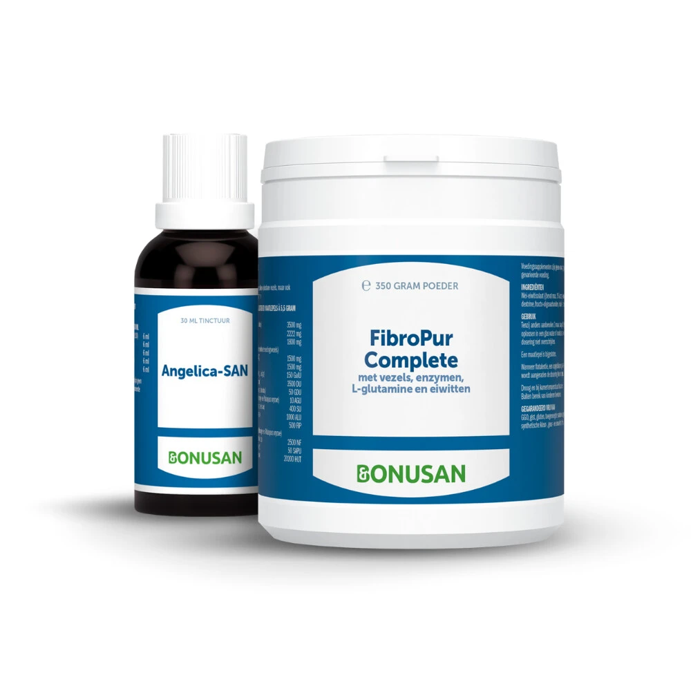 Bonusan Vezels & Spijsvertering PakketBonusan Vezels & Spijsvertering Bundel helpt de spijsvertering* dankzij Angelica, Centaurium en Hypericum. Deze kruiden zitten alle drie in de kruidenformule Angelica-SAN. De vezelformule FibroPur Complete met inuline en FOS maakt deze bundel compleet. FibroPur Complete bevat bovendien een breed enzymcomplex en het aminozuur L-glutamine. De producten in dit pakket vullen elkaar optimaal aan. Kortom: een complete bundel voor vezels en spijsvertering*.
