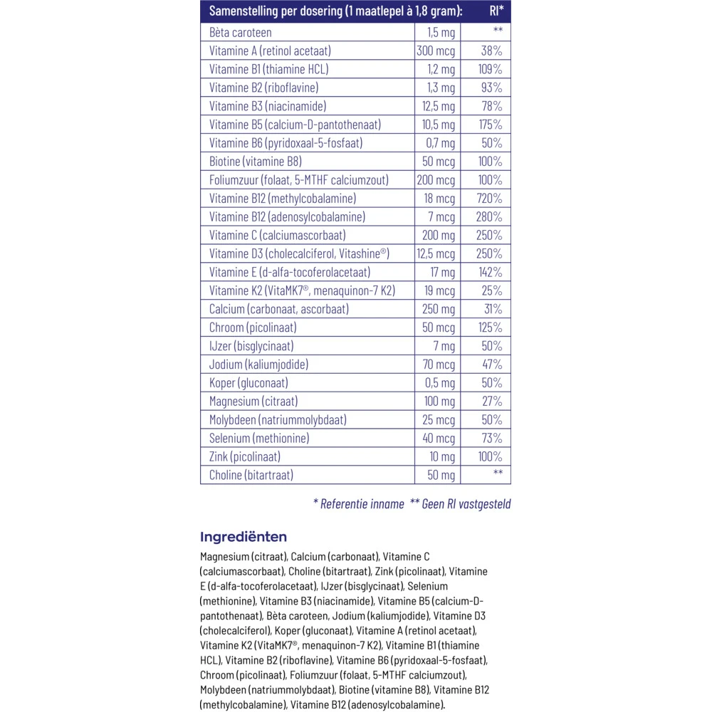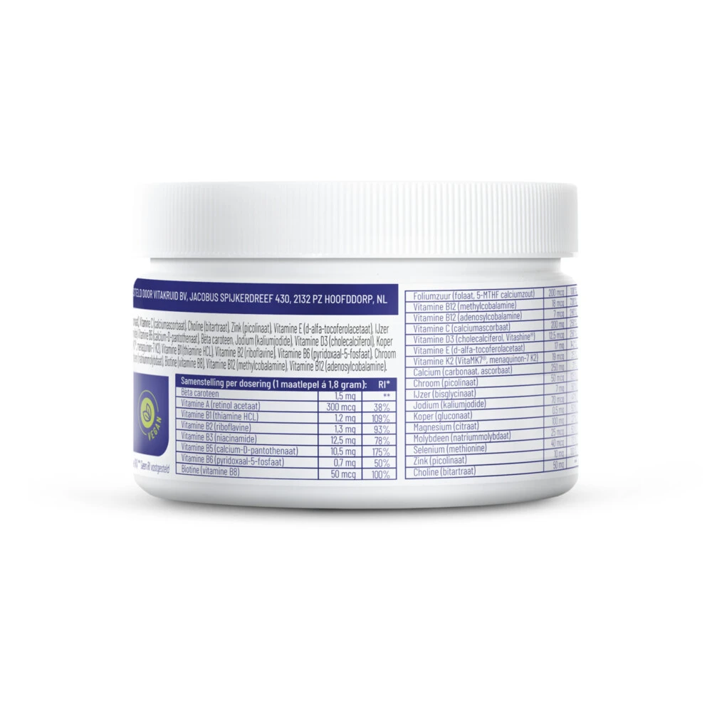 Vitakruid Multi Basis PoederVitakruid Multi Basis Poeder is een vegan basis Multivitamine welke alle nutriënten bevat in de natuurlijke vorm. Vitakruid Multi Basis Vegan Poeder is 100% plantaardig. Het is een zorgvuldig uitgekozen en ontwikkelde aanvulling op een veganistische of plantaardige levensstijl. Deze nieuwe Multivitamine in poedervorm is ideaal voor als je behoefte hebt aan lichtere doseringen met de juiste verhoudingen. Het bevat o.a. twee soorten Vitamine B12, IJzer, Jodium en C