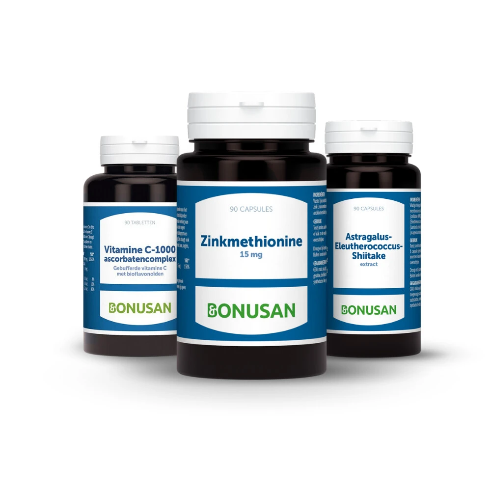 Bonusan Weerstand PakketBonusan Weerstand Pakket is hét basispakket ter ondersteuning van je immuunsysteem, dankzij vitamine C, zink en Astragalus. De bundel bevat Vitamine C-1000 ascorbatencomplex, Zinkmethionine 15 mg en Astragalus-Eleutherococcus-Shiitake-extract. De producten in deze bundel vullen elkaar optimaal aan, zijn zeer goed opneembaar en bevatten zo min mogelijk hulpstoffen.Gebaseerd op wetenschap en jarenlange ervaring van gezondheidsprofessionalsVitamine C met bioflavono&iu